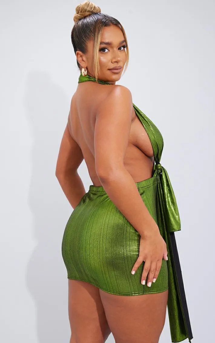 Dare to stand out from the crowd in this unreal dress. Featuring an olive metallic material with a drape design and a mini length. Pair with slip-on heels and a mini bag for a statement finish.