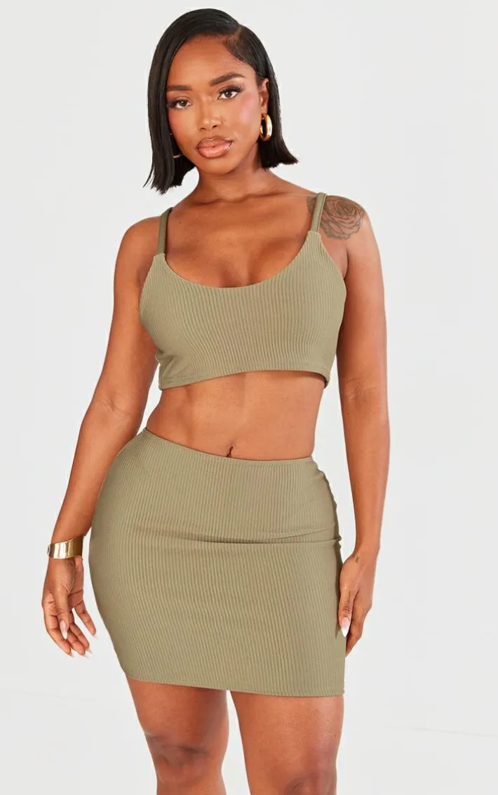 When the weekend calls for a little drama this shape olive ribbed strappy crop top will have you at the center of attention. It is made using an olive ribbed material with a strappy design and a cropped length, what more could you want ? Style this with the matching mini skirt, clear slip-on heels and statement accessories to elevate the look further.