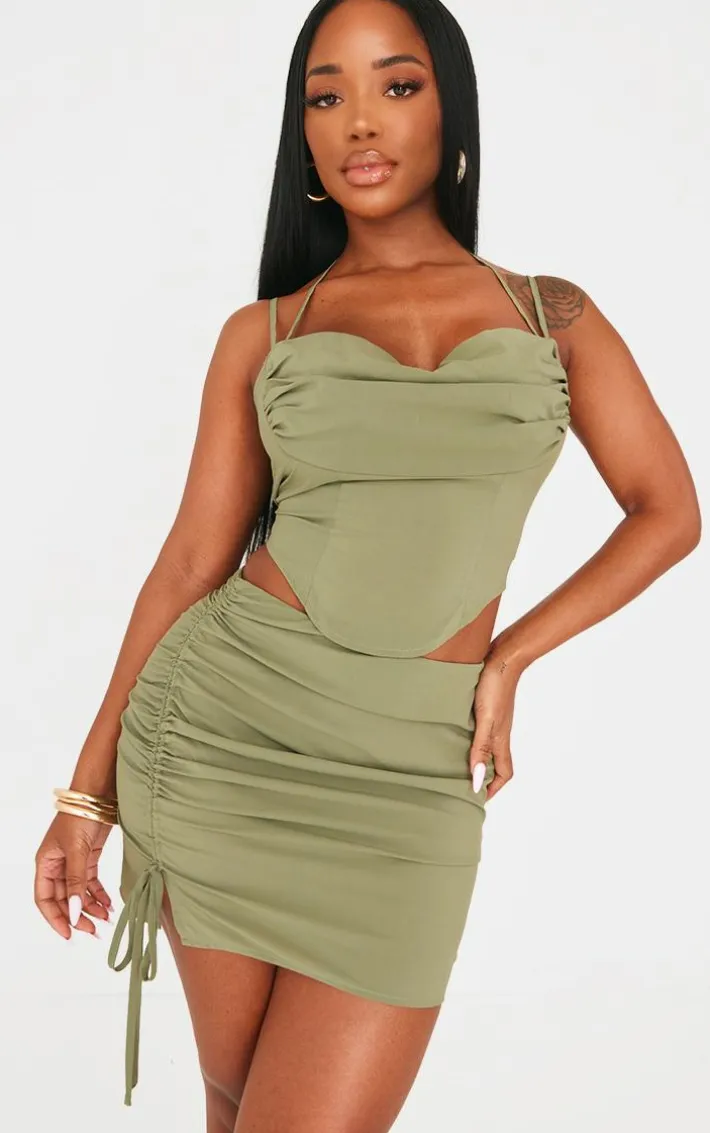 When the weekend calls for a little drama this shape olive woven ruched side mini skirt will have you at the center of attention. It is made using a olive woven material with a ruched side and a mini length, what more could you want ? Style this with the matching skirt, clear slip-on heels and statement accessories to elevate the look further.