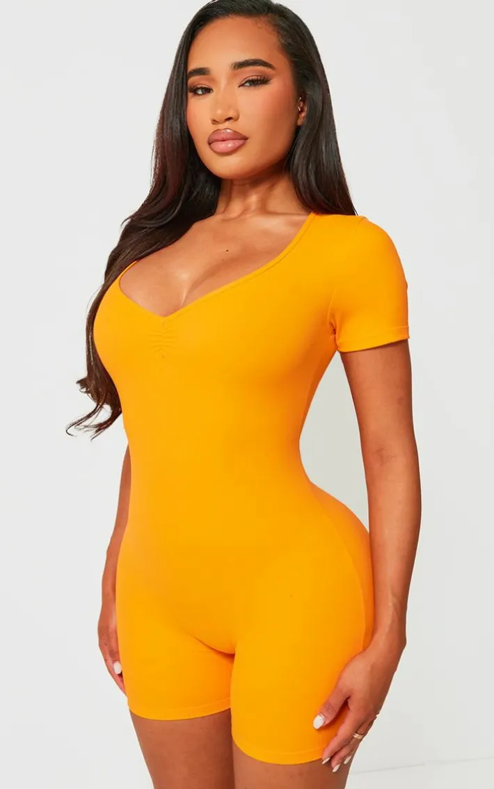 This shape orange sculpted ruched front unitard is here to banish any of your what to wear dilemmas. Brought to you in an orange material with a ruched front and a figure-hugging fit, we canÂ’t get enough. From start to finish this unitard will have you looking totally on-trend. For a next-level look simply style with high heels and accessories for a look that will have you setting trends wherever you step foot.