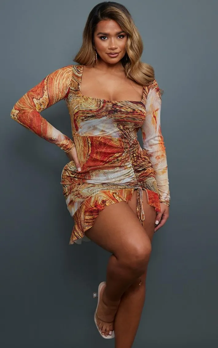 Get ready to have heads turning for all the right reasons with this shape orange swirl print mesh long sleeve ruched side frill hem bodycon dress. It is the perfect piece for bringing all the fierce vibes to your weekend wardrobe. This shape bodycon dress features an orange swirl print mesh material with a ruched side design, long sleeves and a frill hem detail, you’re sure to be in love. Simply pair this dreamy dress with clear heels and gold accessories for a flawless finish.