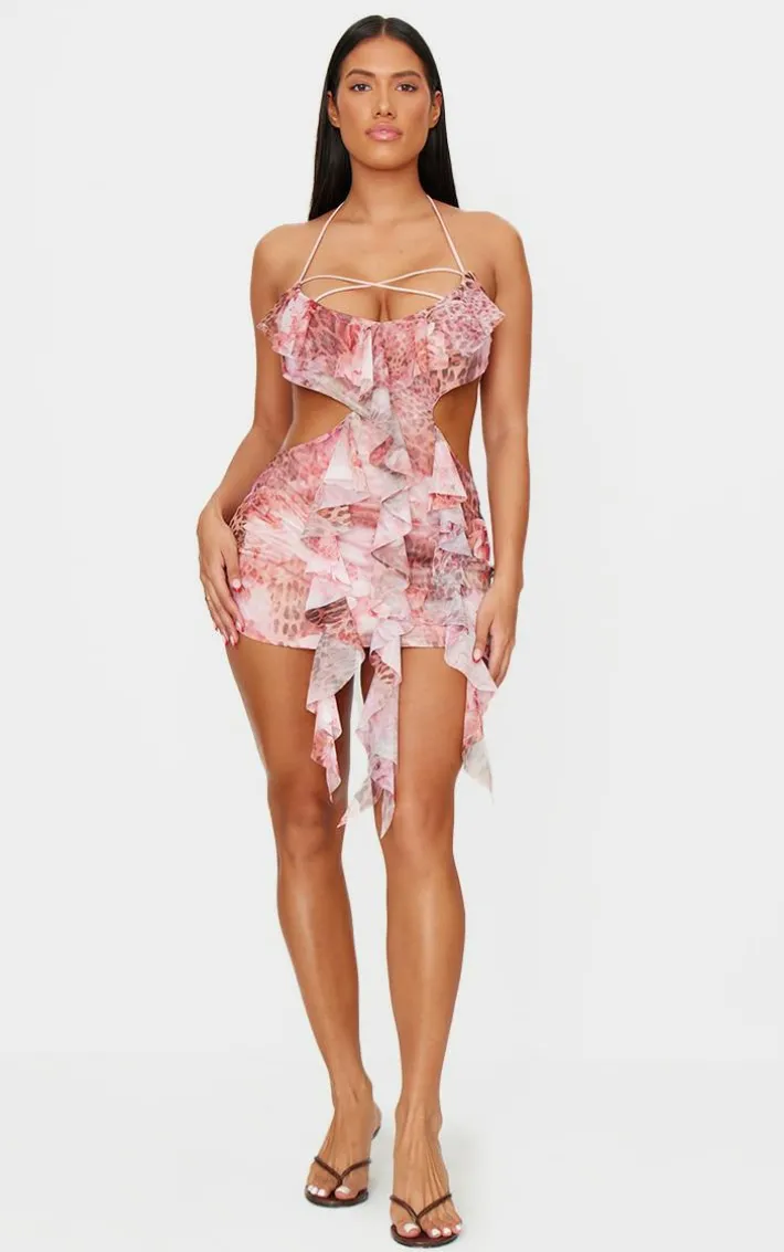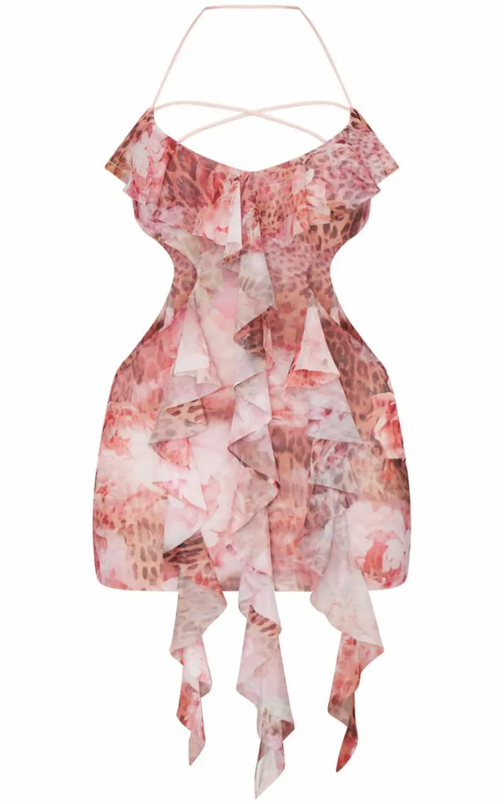 Step out in style with this shape pink mesh printed ruffle open back halter dress. Brough to you in a statement pink hue, mesh material, printed design with ruffle details and an open back cut, how can you not love? Team with a pair of neutral heels and simple accessories to let the dress speak for itself.