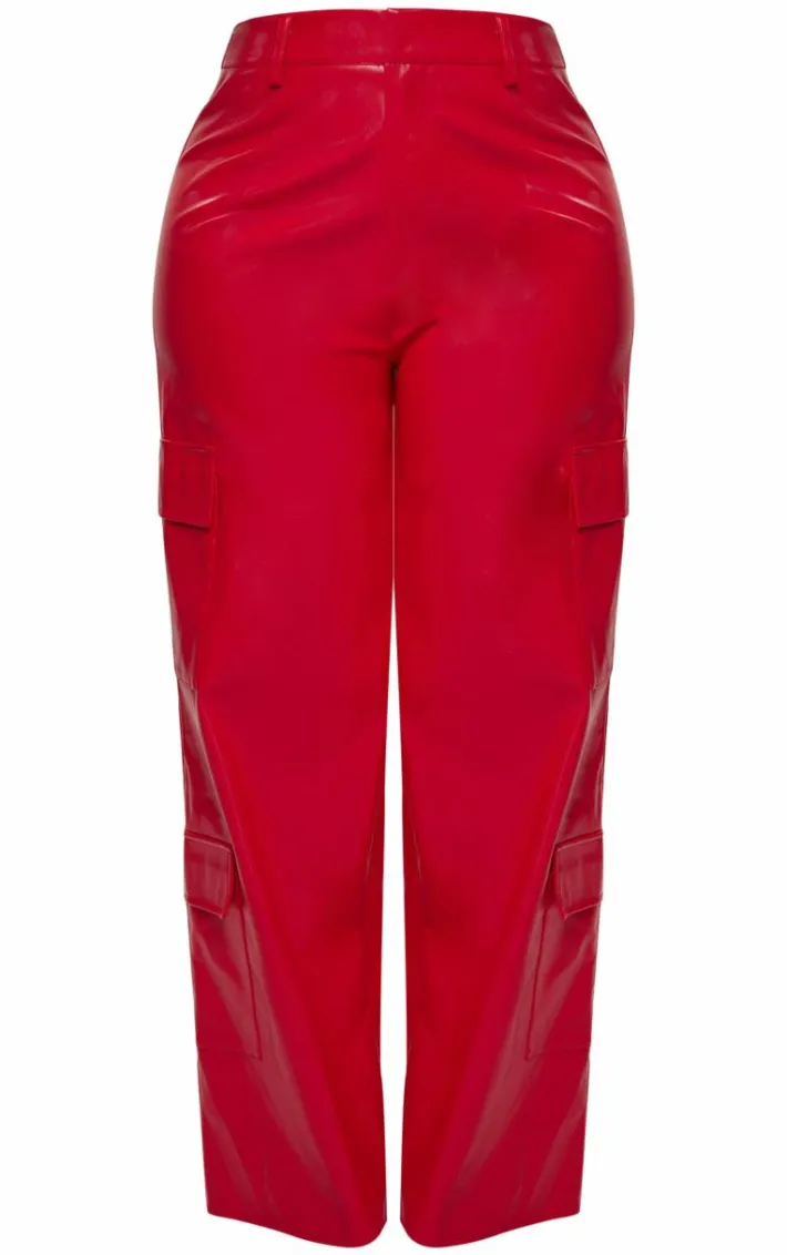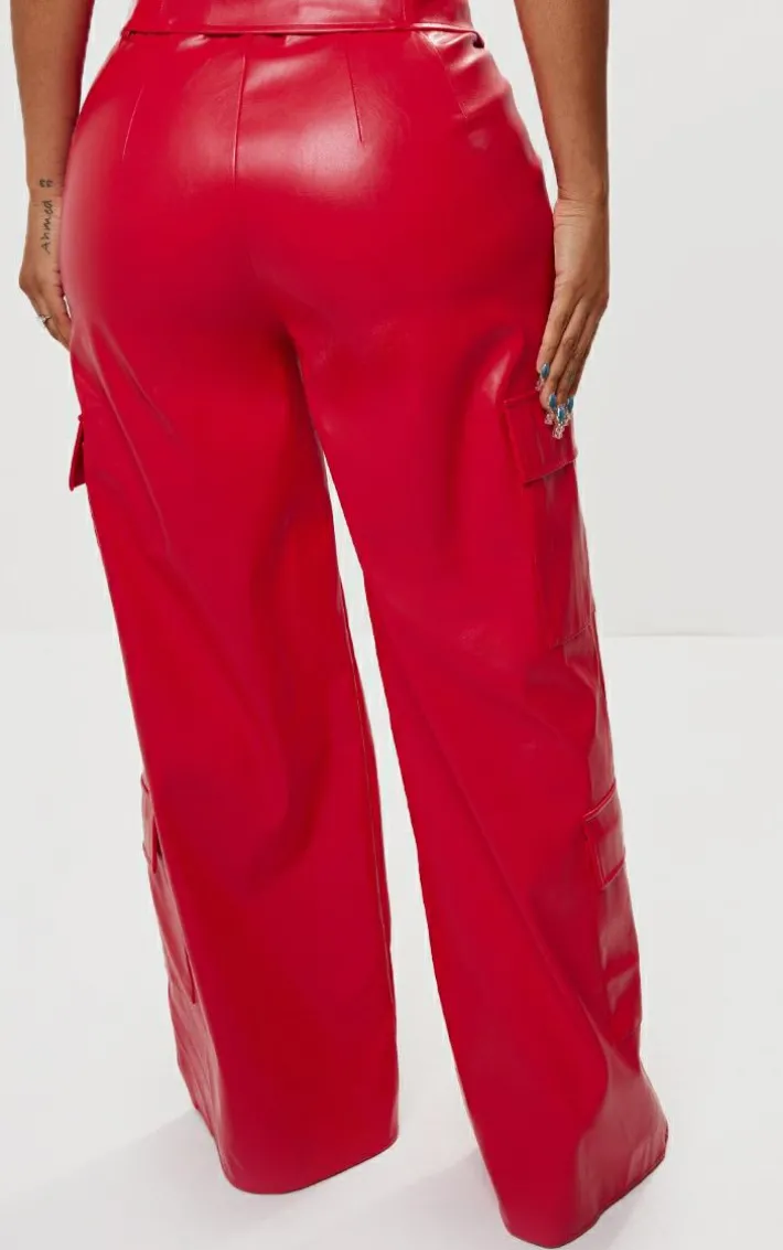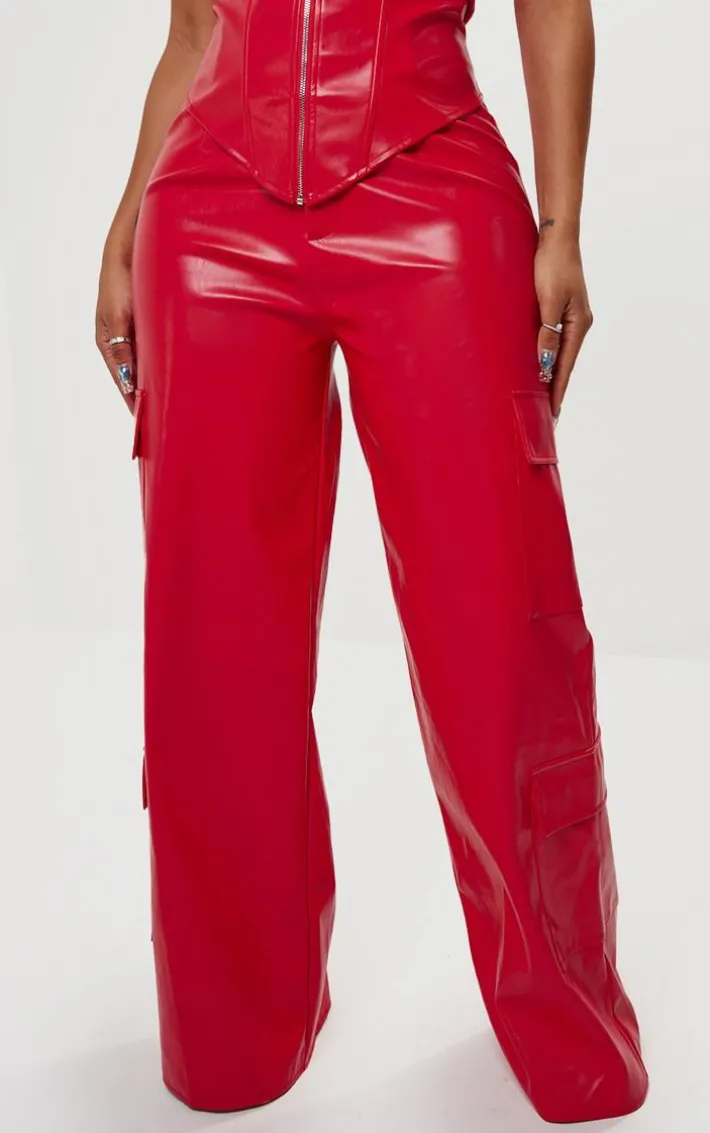 Have all eyes on you in this shape red faux leather straight leg cargo pants. Brought to you in a red hue faux leather material with a straight leg fit and a cargo design, we are obsessed. Style these faux leather pants with the matching top and heels for a look that will make a serious style statement this weekend.