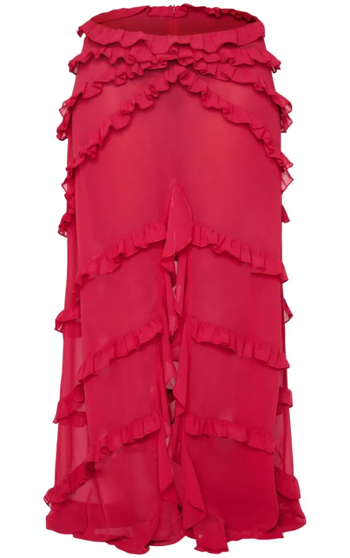 Accentuate your best features with this shape red low rise frill detail front split maxi skirt. Made with a low rise design, frill detailing and a front split feature, it’s a fierce party piece. Elevate your look with a matching red top, heels and gold accessories.