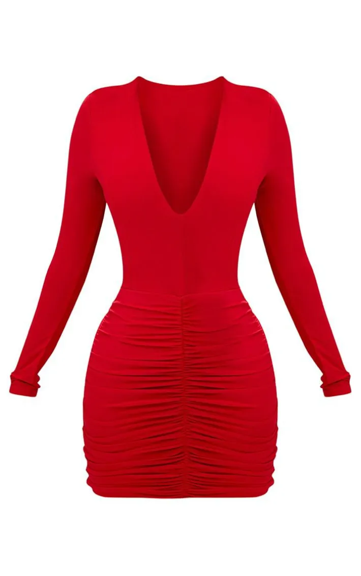 we are totally crushing over this statement red slinky mini dress, a style you can wear again and again. Featuring a red slinky material with a ruched design, long sleeves, a v neckline and a mini length- we are obsessed. A ruched dress gives your curves all the love with a cinched design for a look that is sure to show off your confident side. Have legs for days and style with a pair of statement heels, a choker and get ready for a night.