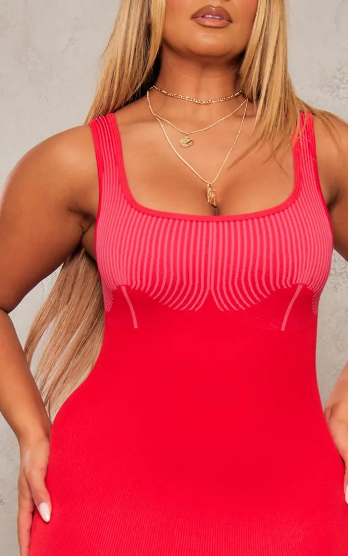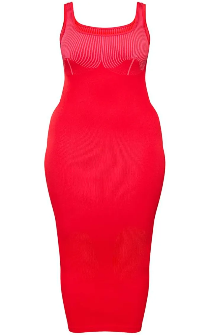 Get ready to have all eyes on you with this shape red snatched rib contrast midi dress. Brought to you in a red snatched rib material with a contrasting design and a midi length, whatÂ’s not to love? With itÂ’s figure-hugging fit and statement hue youÂ’ll sure to earn all the likes with this dreamy piece. Finish off the look by pairing this with a pink trench coat, clear high heels and accessories. ItÂ’s a yes from us.