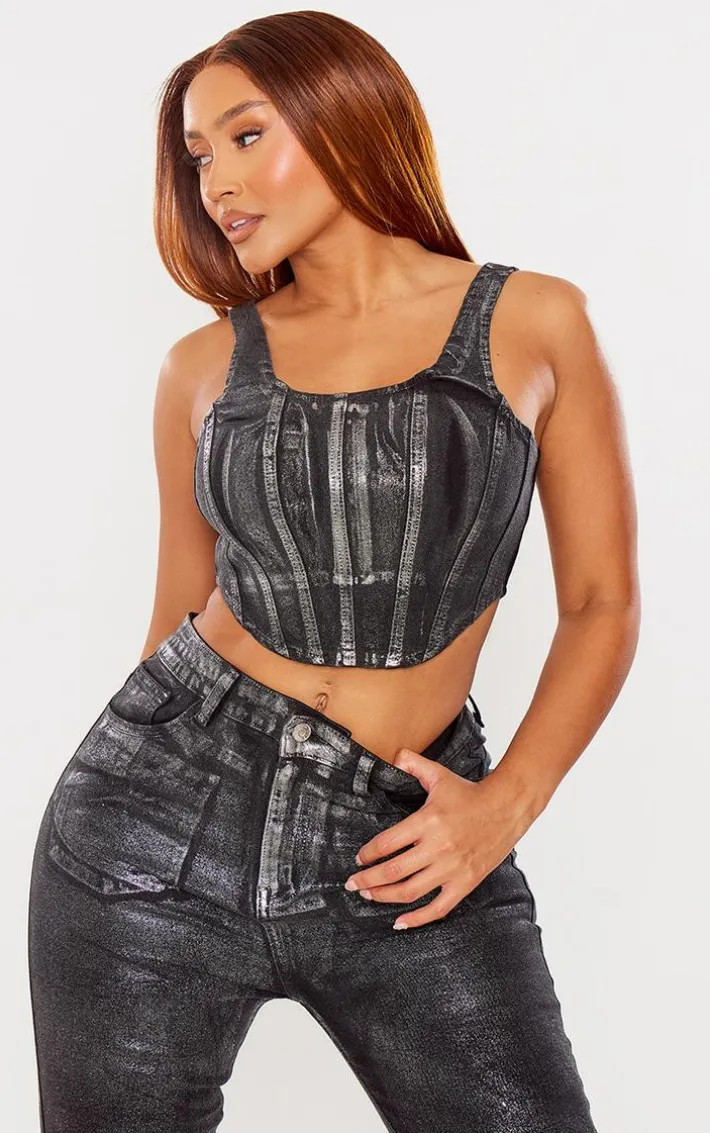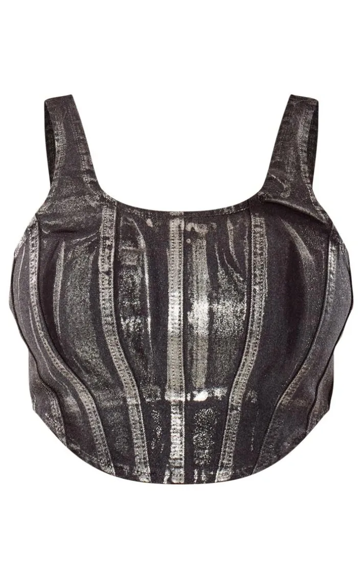 Take your weekend wardrobe to new heights with this shape silver denim metallic corset top, you’re sure to be earning all the likes. With a silver metallic denim material, a figure-flattering corset design and a zip fastening, you’ll be obsessing over this top. Team it with the matching bottoms, slip-on heels and hoop earrings for a look that will get you noticed.