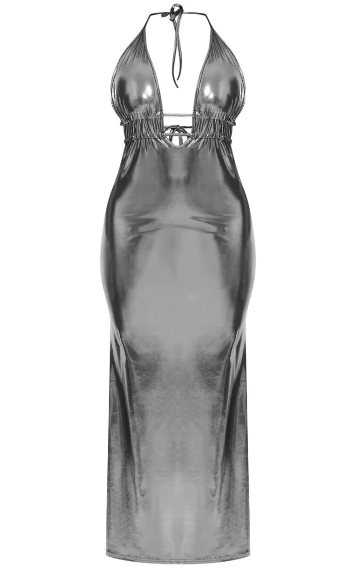 Make a statement with this shape silver metallic wet look plunge front halter neck maxi dress. Brought to you in a metallic silver hue, with a wet look design, flattering plunge front and halter neck line, opt for this for your next occasion. Style effortlessly with minimal accessories and a pair of heels for a fool proof finish.