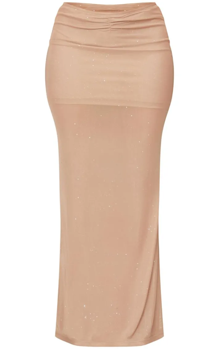 Make a statement whatever your weekend plans are with this shape stone glitter low rise ruched front fishtail maxi skirt. Brought to you in a versatile stone shade, with glitter detailing, a low rise fit, ruched front material and fishtail design for a figure-flattering finish. Style with a pair of heels and the matching bralette for chic look.