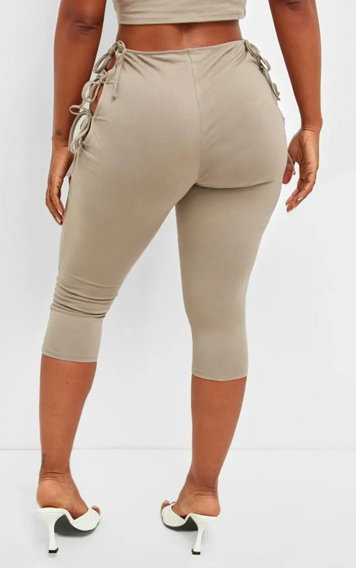 Set major trends with these shape taupe cotton tie detail capri leggings. Brought to you in a taupe cotton material with a tie detail giving you a flattering fit that will have all eyes on you. These capri leggings pair perfectly with the matching crop top and your fave heels for a fool proof finish that will earn you all the styling points.