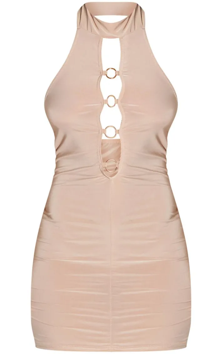 Show off your shape in this shape taupe slinky ring detail racer neck bodycon dress. Brought to you in a taupe slinky material with a ring detail and a racer neck design, this dress is all the luxe you need. Style with gold heels and accessories for a figure-flattering fit that will earn you all the likes.