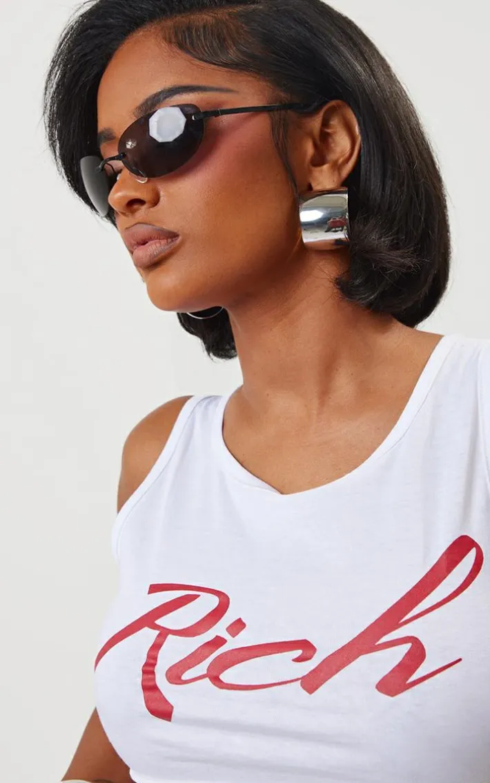 Steal all the stares in this shape white cotton rich graphic extreme crop top. Brought to you in a white hue cotton material with a ‘Rich’ graphic detail and extreme cropped length, this top is everything you need and more. Style with ruffle shorts, red heels and silver accessories for a jaw-dropping finish we can’t get enough of.