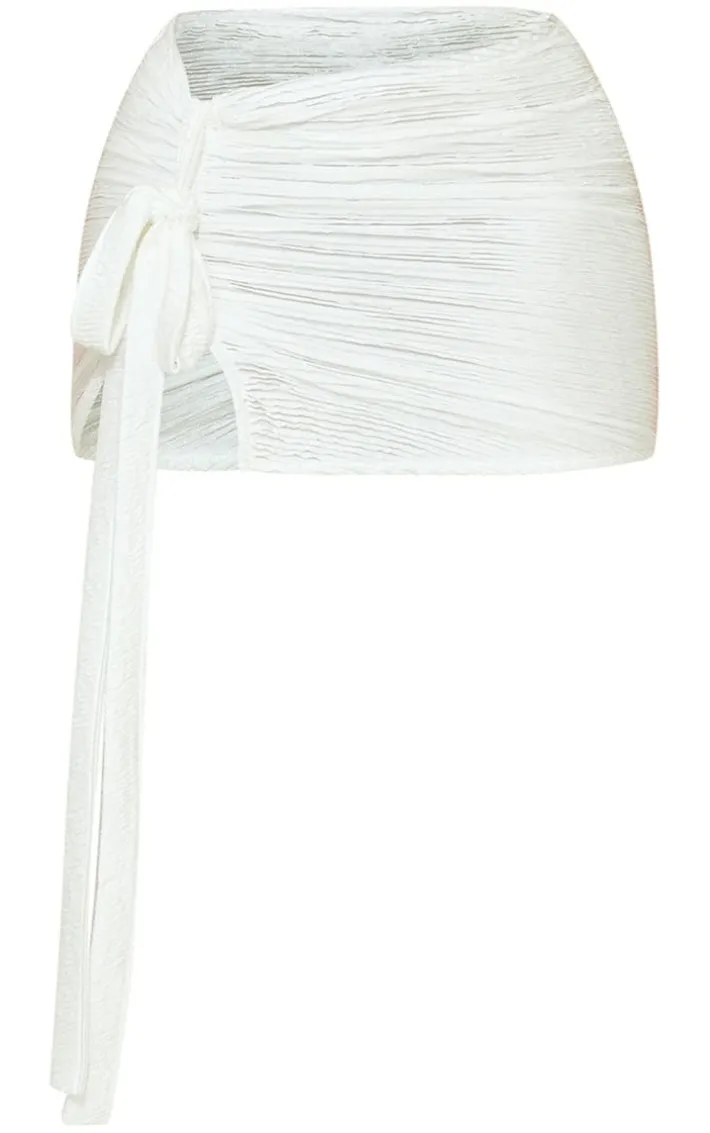 Make them stop and stare in this shape white crinkle rushed tie detail mini skirt. This mini skirt is brought to you in a white crinkle material with a ruched design for a flattering fit we are loving. With a tie detail and a mini length, what’s not to love? Team with a cropped tee and some clear heels to elevate the look even further.