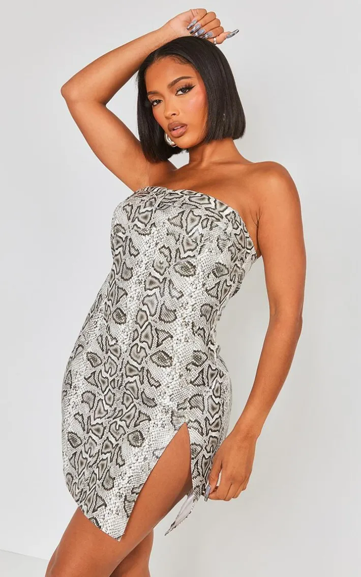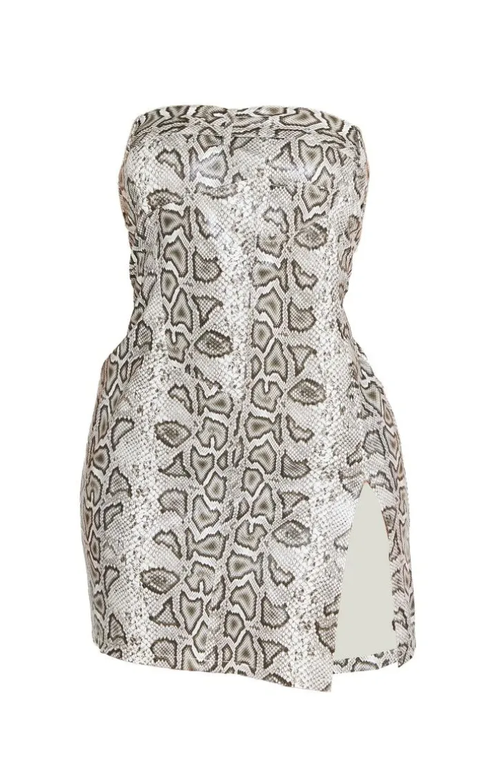 This shape white faux leather snake print bandeau mini dress is all the new you need to elevate your look this season. Brought to you in a white faux leather material with a snake print design, what’s not to love? With a mini length, what more could you want ? Team with some clear heels for a look that will earn you all the styling points.