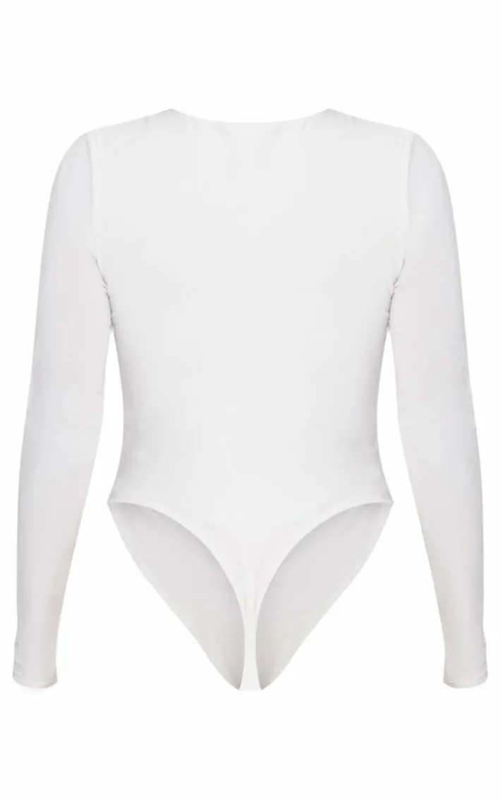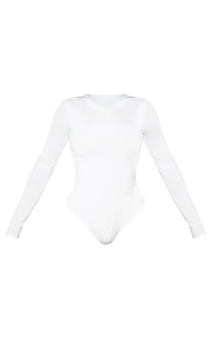 Give your look a refreshing hit of white with this simple streamline bodysuit. Featuring a white slinky material, long sleeves and popper fastenings, team it with some popper sweatpants and heels for a look with some serious attitude.