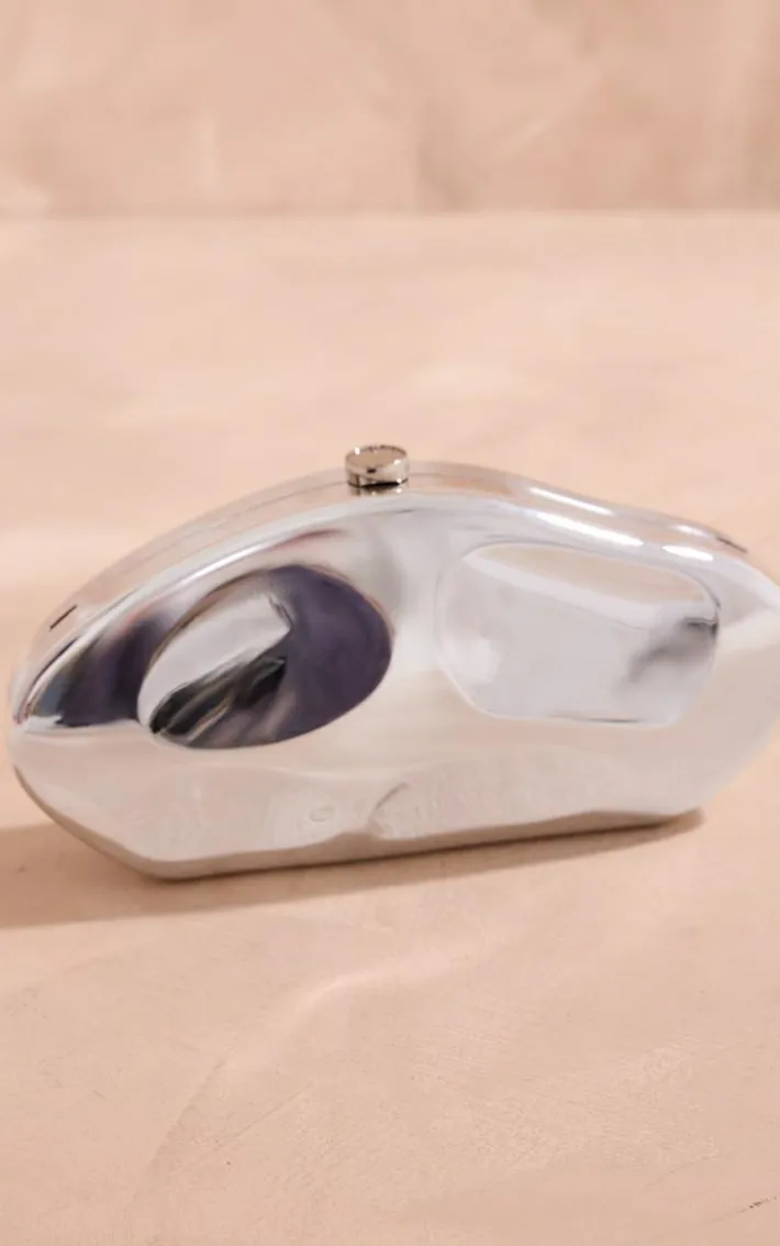 Bring all the glam vibes to your weekend look with this silver abstract oval hard clutch bag. Made from a silver material with an abstract design, and a hard oval shape, what more could you want? Style this clutch bag with a statement outfit for the perfect finishing touch to any look.