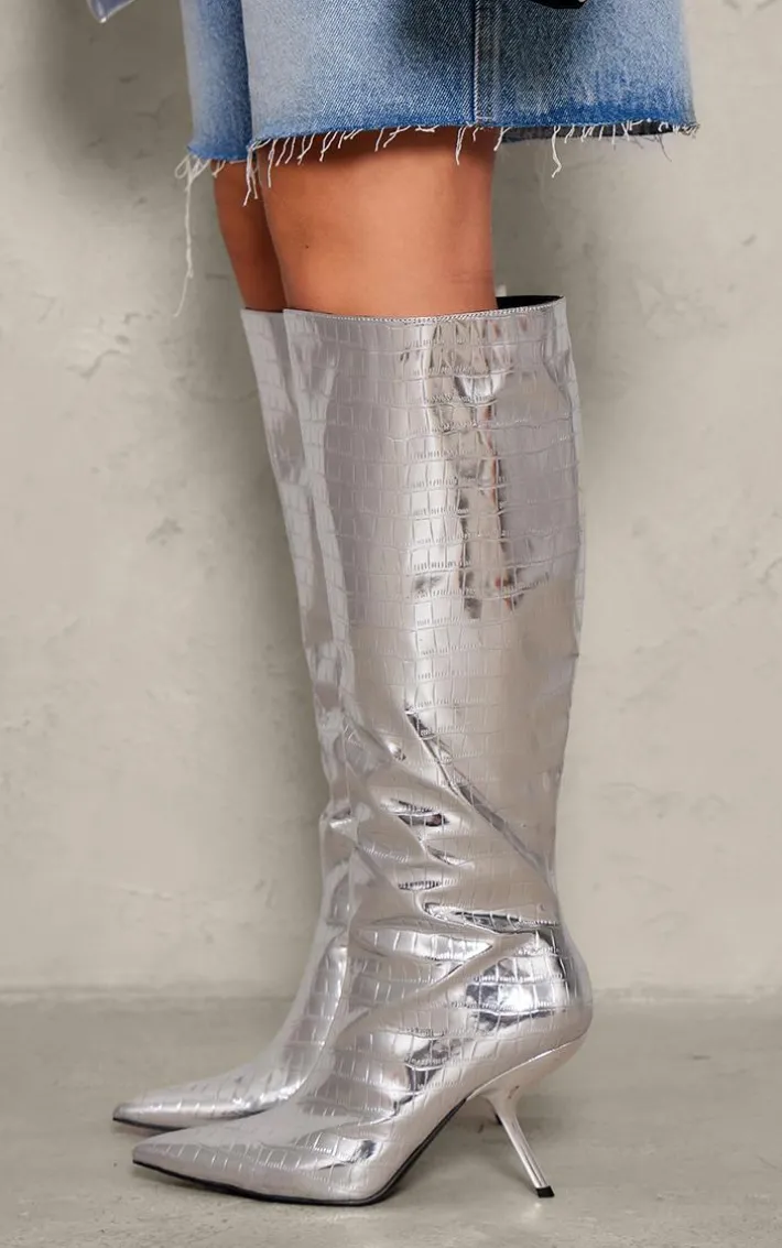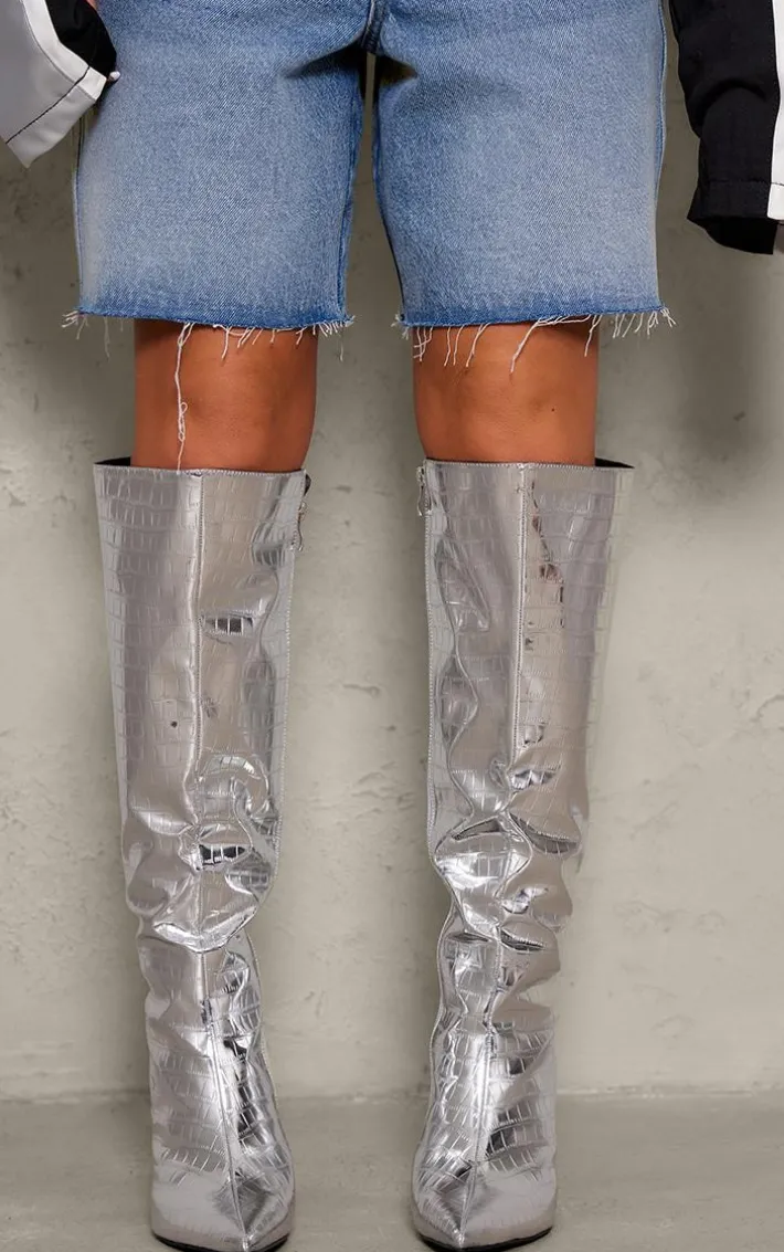 Have all eyes on you with these silver metallic PU croc point toe slanted heel knee high boots. These boots are brought to you in a silver metallic PU croc material with a pointed toe, a slanted heel and a knee-high design, what’s not to love? These boots are calling your name. Style these with your outfit of the day for a combo like no other.