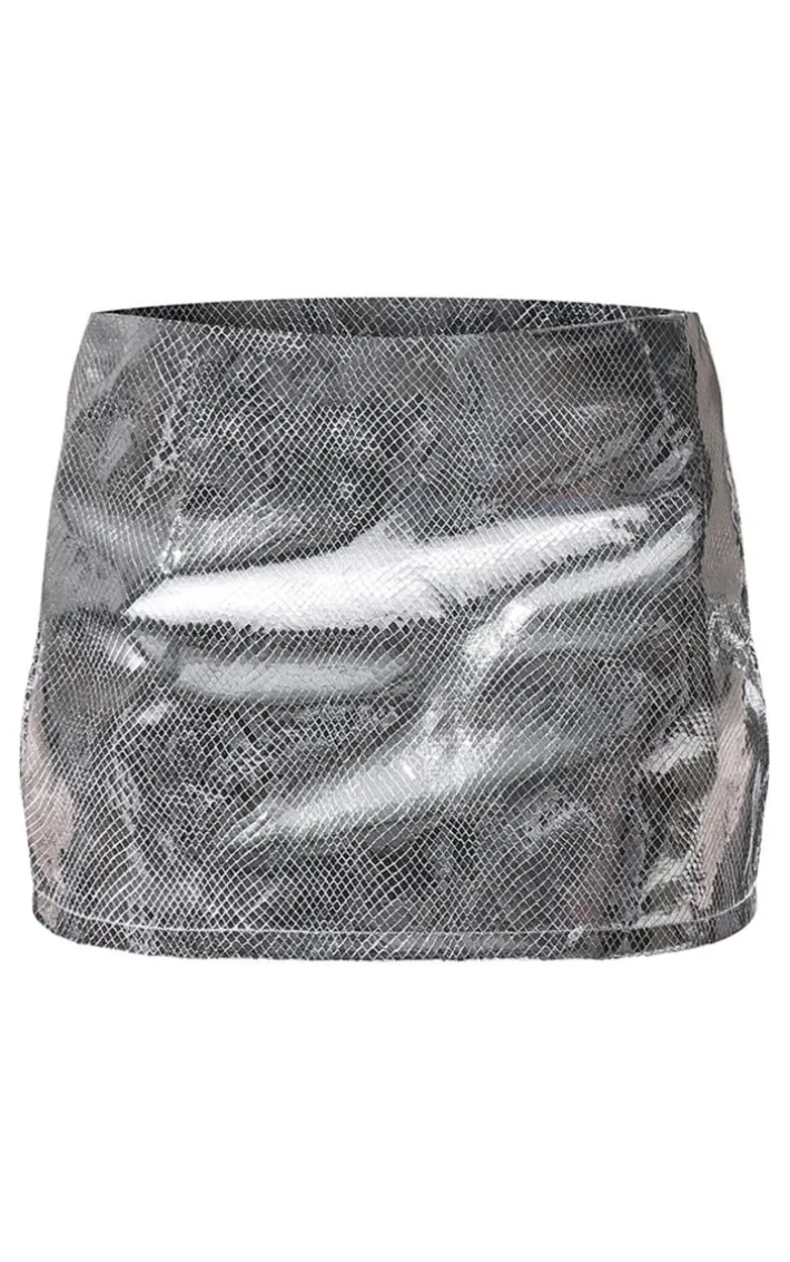 You won’t blend in with this silver metallic textured faux leather low rise micro mini skirt. Brought to you in a silver metallic faux leather material with a textured design and a low rise fit, what’s not to love? Its micro mini length, you are sure to turn heads no matter what. Style with the matching top, jacket and a pair of heels to make a statement wherever you step foot.
