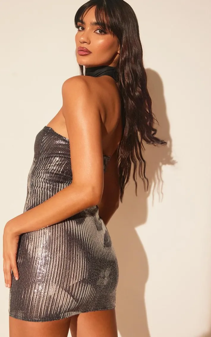 Get ready to make a serious style statement in this silver printed sequin glitter bandeau bodycon dress. Brought to you in a silver hue glitter material with a printed design and sequin detailing for that extra touch of glam, you really can’t go wrong. This flattering bodycon dress featuring a bandeau neckline that we just can’t get enough of right now. Just add your highest heels and some luxe accessories for the perfect finishing touch.