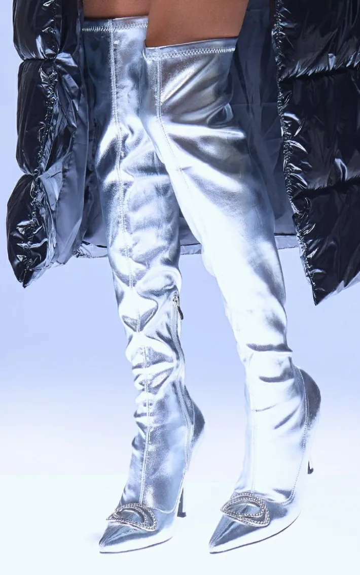 Channel all the fierce vibes into your new season wardrobe with these silver PU point toe diamante buckle over the knee high heeled boots, you’re sure to be earning all the compliments. Made using a silver PU material with diamante detailing and an over the knee design, you’ll be adding these boots to your wish list. Pair with your fave weekend fit for a next level look.