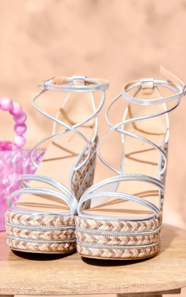 Make a statement this season with these silver Pu round toe asymmetric strap diamante platform heeled wedges. Brought to you in a silver Pu material with a round toe design and asymmetric strap details with a diamante platform, these heeled wedges are like no other. Style with a beachy outfit of the day for a look that won’t miss.