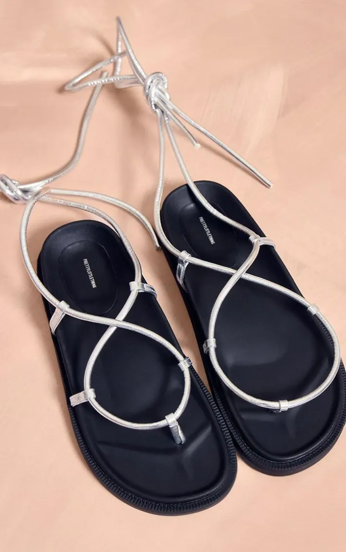 No look is complete without these silver PU round toe cross over strap lace up chunky sandals. Brought to you in a silver PU material with a round toe design and a crossover strap detail. These lace up chunky sandals are must have for those off-duty days. Team with your outfit of the day to turn heads this season.