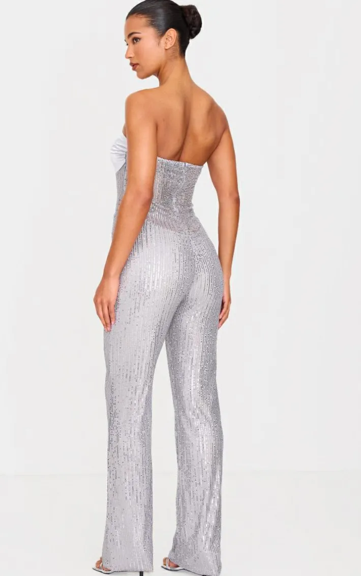 Elevate your winter wardrobe with this silver sequin bandeau sheer panel jumpsuit. Brought to you in a silver material with a sequin bandeau neckline and sheer panel design, this jumpsuit is all the new you need. Team with slip on heels and simple accessories for a look that won’t go unnoticed.