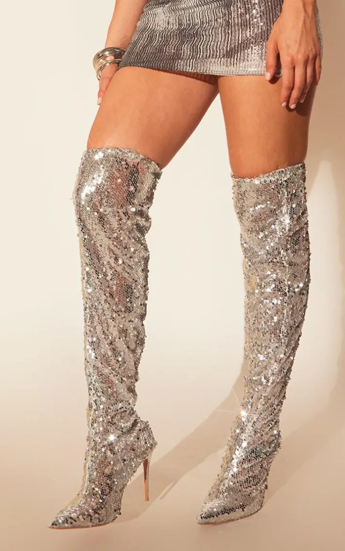 Looking to add a statement touch of glam to your weekend look? we’ve got you covered with these silver sequin point toe over the knee heeled boots. Brought to you in a silver sequin material with a point toe design and an over the knee style, we just can’t get enough. Style these sequin boots with your weekend wardrobe pieces to take any look from 0-100.
