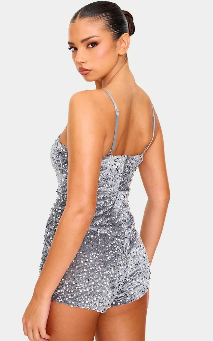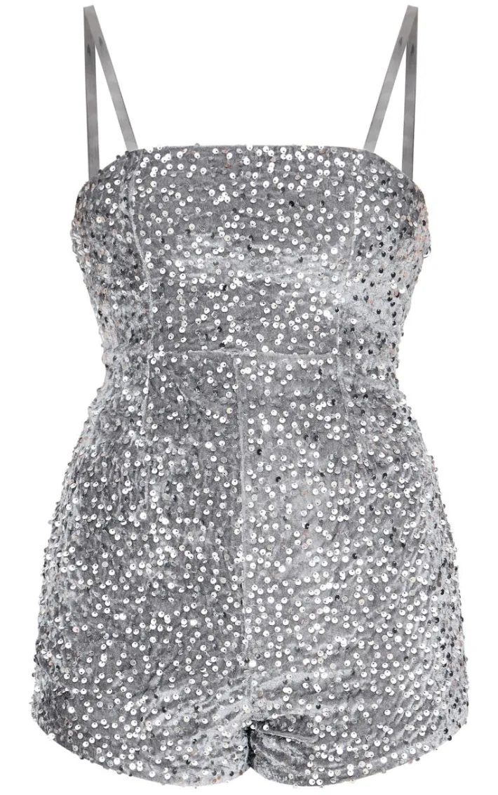 Stand out from the crowd for all the right reasons in this silver strappy sequin hot Pant romper. Brought to you in a silver sequin material with thin straps and a flattering fit, how can you resist? Style this silver romper with heels and accessories for a look that is perfect for your weekend plans.