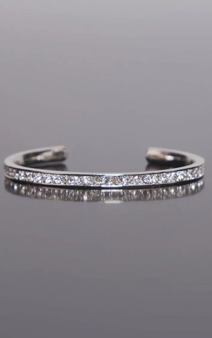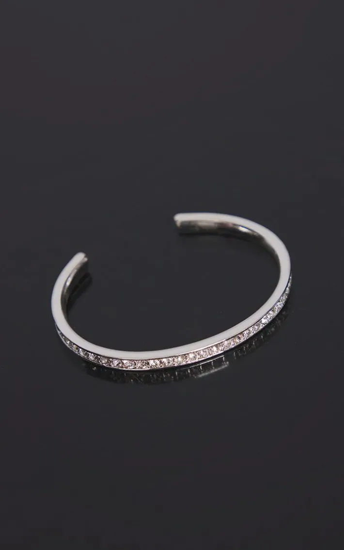 Take your new season wardrobe to a whole new level with this bangle. Featuring a silver hue material with diamante detailing and a thick design, we’re obsessed.