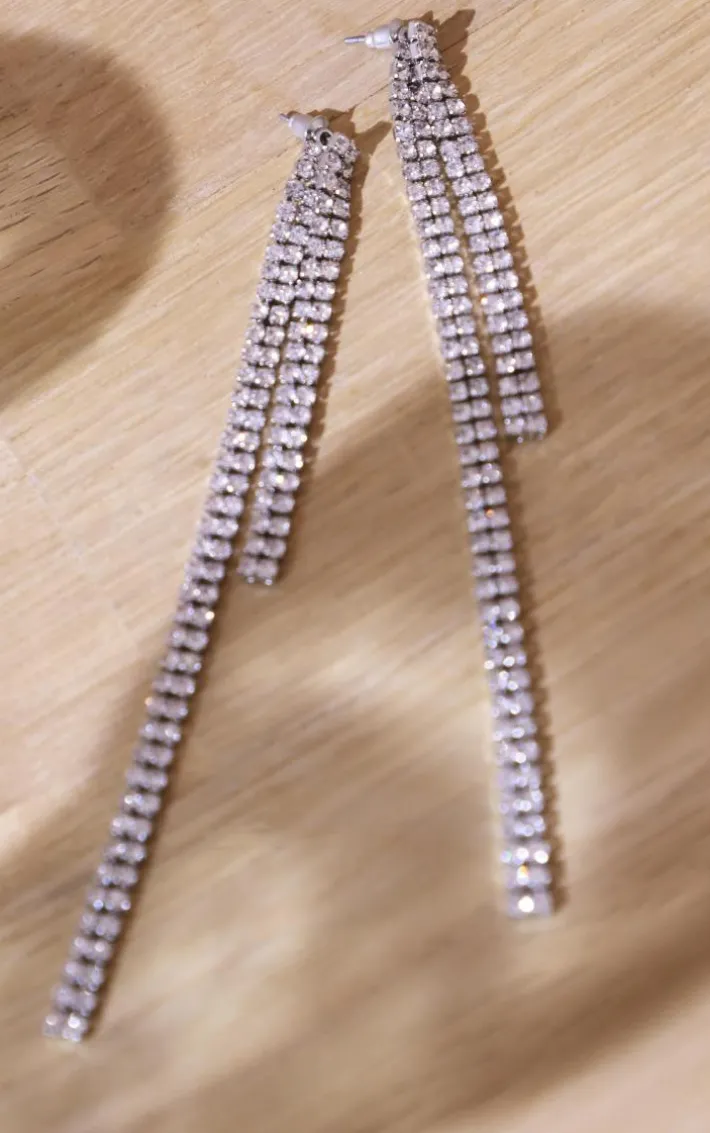 These dainty earrings are sure to be your new weekend go-to- Featuring a silver material with a thin diamante design, we are obsessed. Add to your look for an instant elevation.