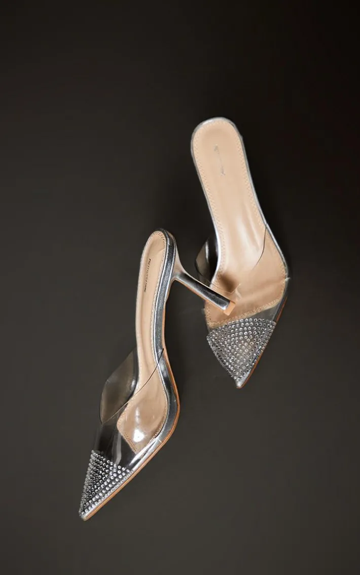 Sparkle your night away with these mules. Featuring a silver vinyl material with a diamante pointed toe and a high court heel, we’re in love.