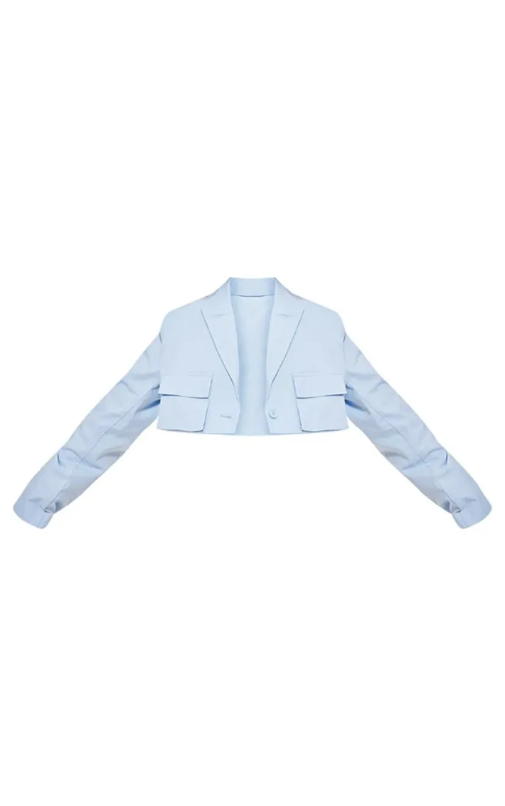 Say hello to your new season staple with this sky blue linen look pocket detail super cropped blazer. Brought to you in a sky blue linen look material with a pocket detail and a super cropped length, how could you say no? Style effortlessly with a two piece set and box-fresh kicks for a look that will turn heads for all the right reasons.
