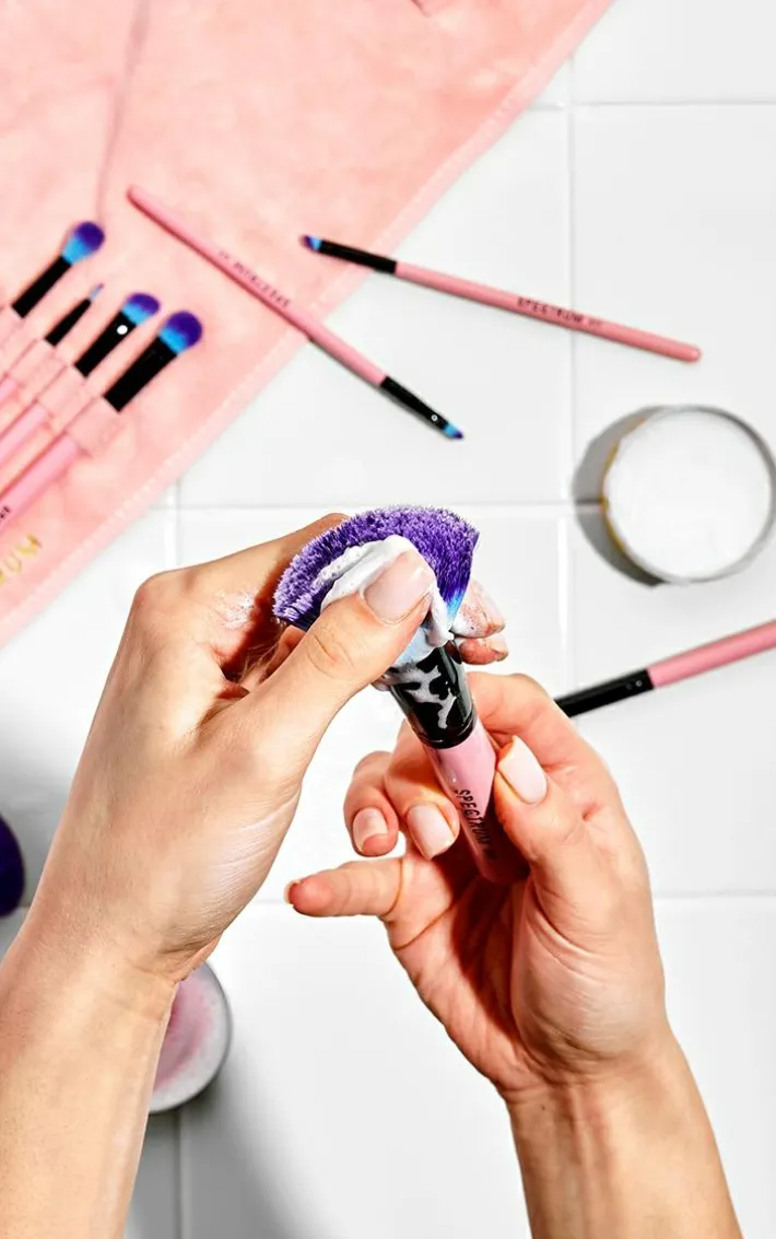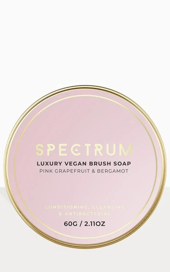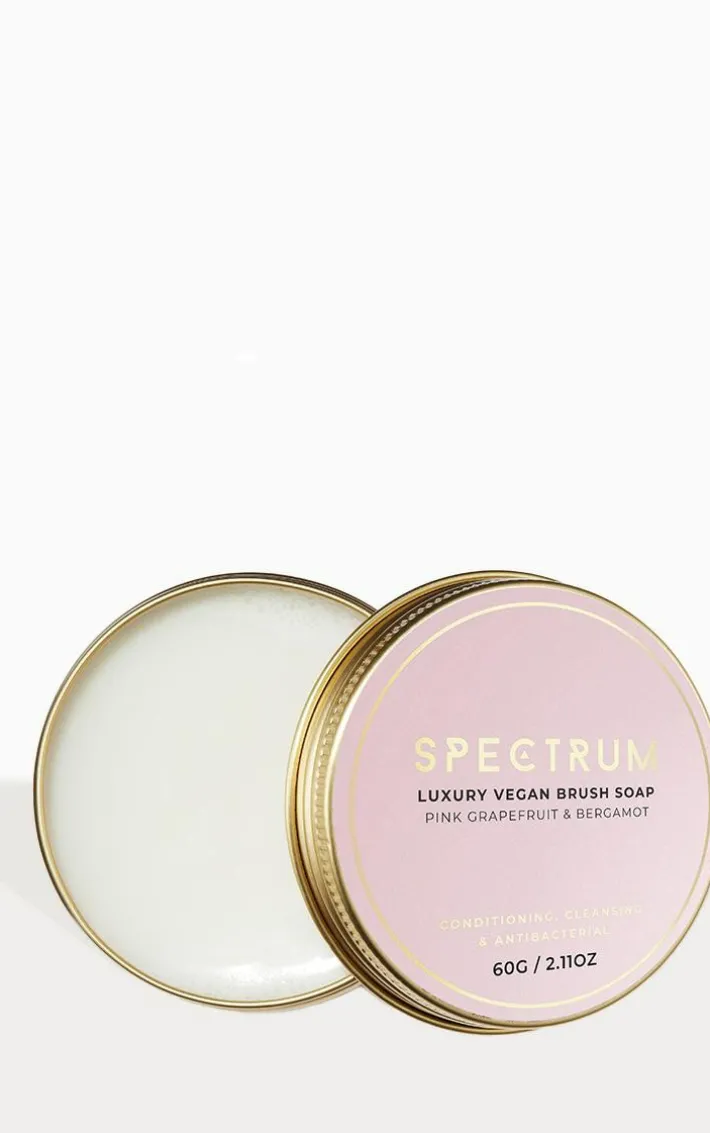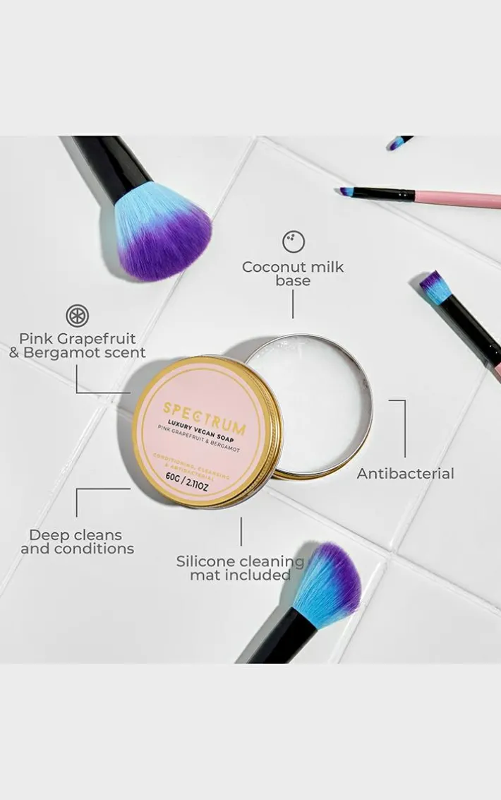 There’s no better feeling than clean makeup brushes, so keep your brushes fresh and rid them of any product build-up and bacteria with Spectrum Collections 100% vegan solid brush soap with silicone cleaning mat. Made with a luscious Bergamot and Pink Grapefruit scent, this solid soap will deep clean and condition your brushes at the same time. The process is simple – wet your brush under cold water or lukewarm water and lather in the soap using a swirling motion to clean the bristles, use the silicone cleaning mat in the lid to remove build up, and excess – continue these actions in formation, until all product build up removed. Wipe away any moisture and leave brush to dry using the Spectrum collections brush cleaning towel or another soft flannel/towel.