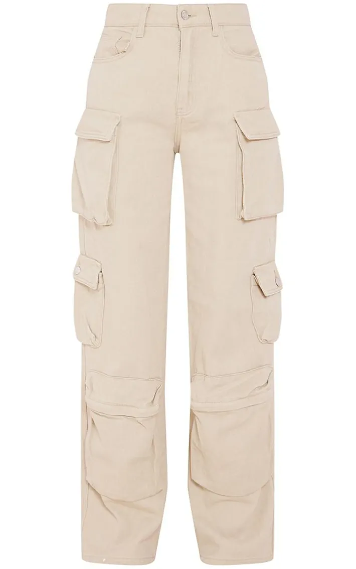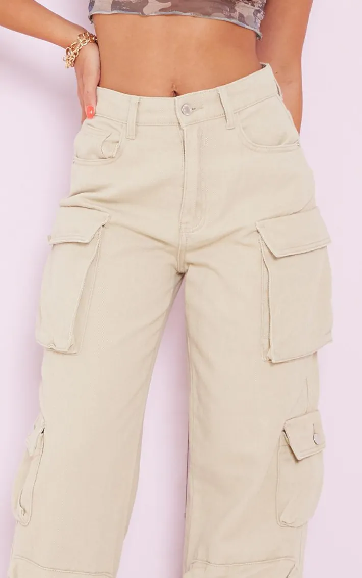 Be ready to set trends with these jeans. Featuring a stone cargo material with pocket detailing and a wide leg fit, what’s not to love? Style with a mesh print crop top and high heels to level up the look.