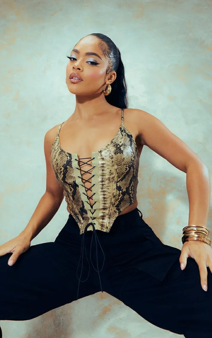 This stone faux snake Pu lace up corset will have hearts racing for all the right reasons. Brought to you in a stone Pu material for a little extra edge, and a snake design that will have you setting trends wherever you step foot. With a lace up detail, this corset will be your new go-to for those ‘jeans and a nice top’ combo’s. Team with some of your fave accessories and a pair of your go-to heels to complete the look we are loving.