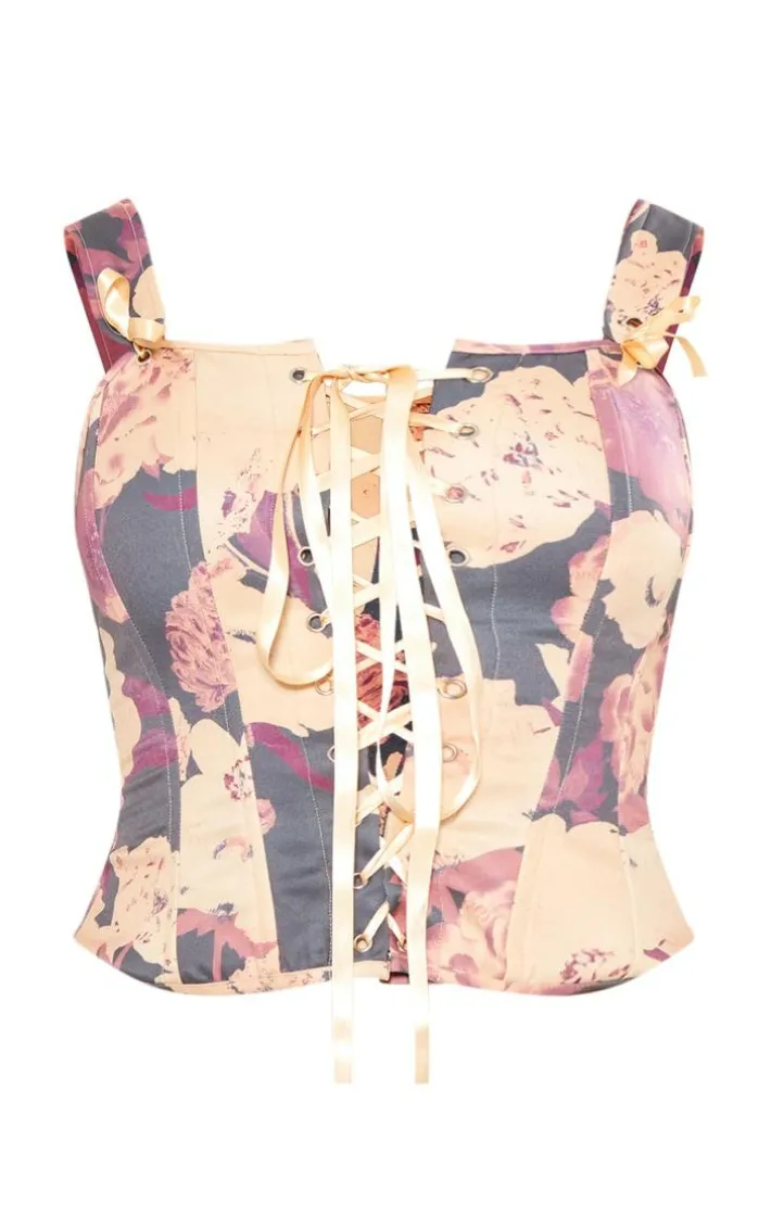 When your new season wardrobe is in need on some dreamy floral prints, look no further than this stone floral print woven structured lace up corset crop top. Brought to you in a stone hue woven material with a floral print design, a flattering structured corset fit and lace up detailing for that extra touch of glam, how can you not fall in lace? Style this crop top with wide leg pants, your highest heels and gold accessories for a look that won’t go unnoticed.