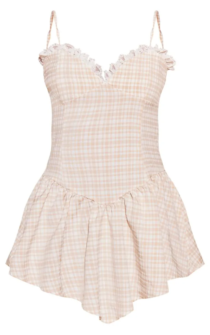 Get ready to earn all the compliments in this unreal stone gingham lace frill strappy shift dress. This dress features a stone hue gingham print material with lace trim detailing and thin straps, it is perfect for dressing up or down. Style this gingham dress with cowboy boots and your fave accessories for a fool proof finish.