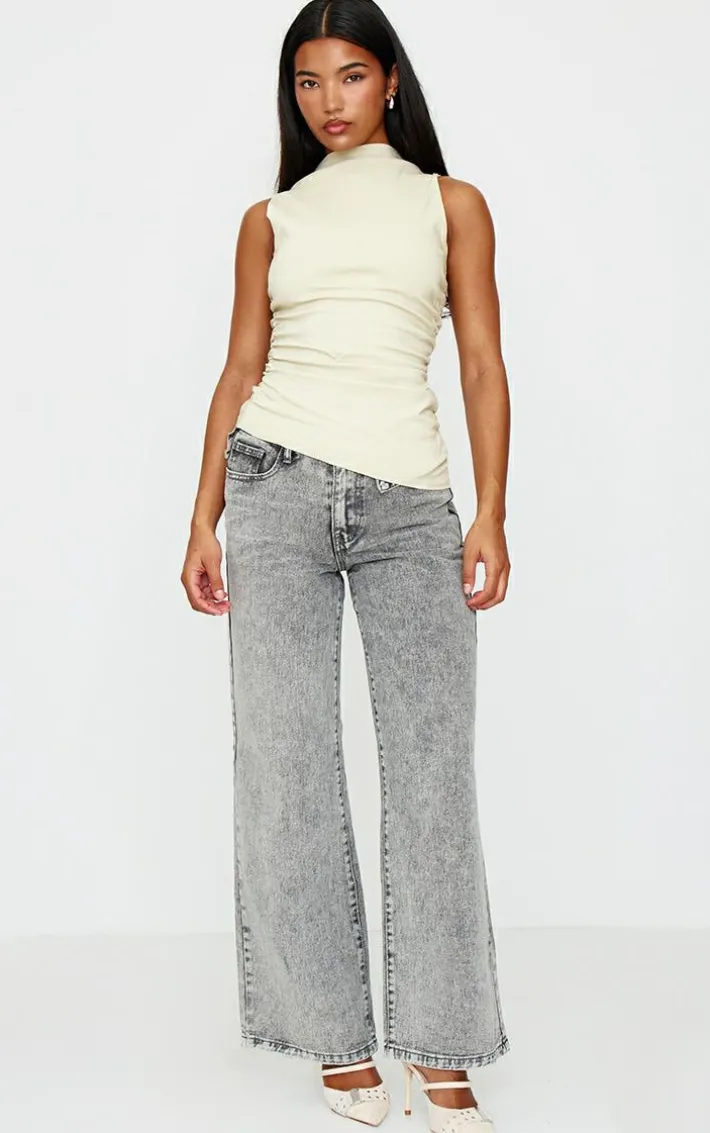 We can’t get enough of this stone high neck ruched asymmetrical long top for a new season look. Brought to you in a dreamy stone hue, with a high neck design, ruched detailing and asymmetric feature, you’ll be reaching for this daily. Style with a pair of grey wide leg jeans, cream heels and a shoulder bag to complete the look.