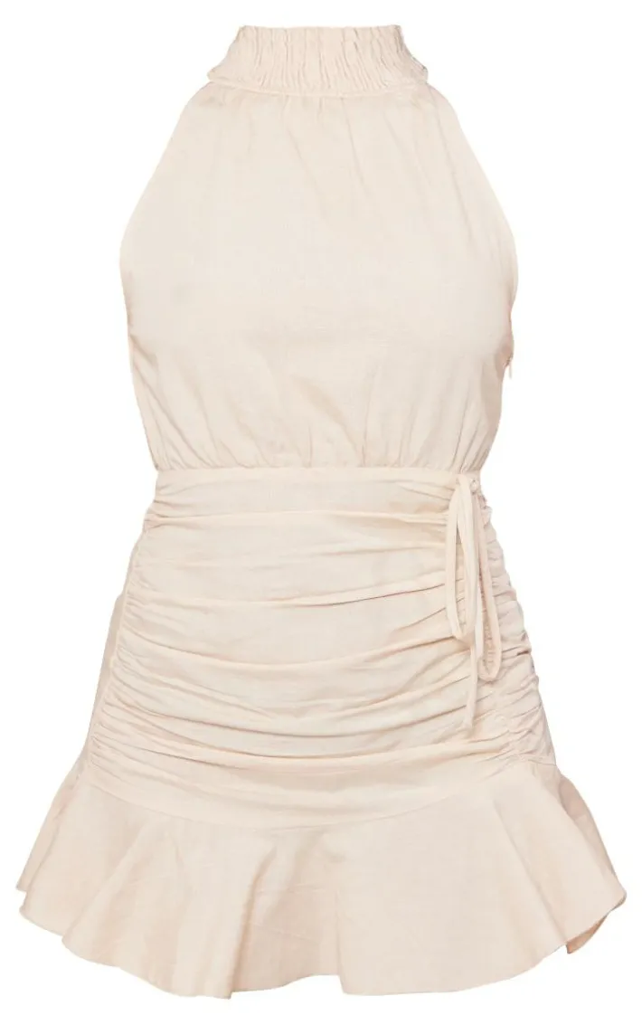Enter the new season in style with this stone linen look shirred high neck frill hem bodycon dress. Brought to you in a stone hue linen look material with a chic high neckline, shirred detailing and a frill hem design that is brining all the glam, how can you not fall in love? Style this linen look bodycon dress with sandals and an oversized clutch for an effortlessly chic look worthy of your weekend plans.