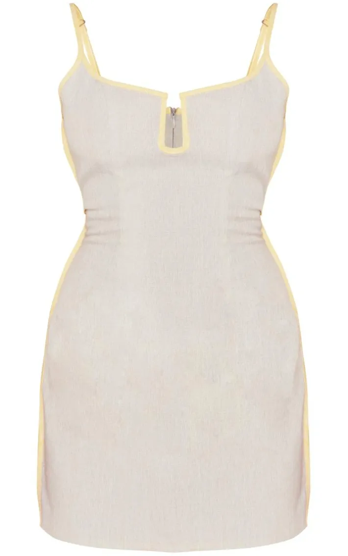 Make a statement this season with this stone line look v bar contrast seam strappy bodycon dress. This unreal dress is sure to solve all of your ‘what to wear dilemmas’. With a stone linen look material that will steal all the stares, and a v bar detail, you will be feeling effortlessly chic. With a contrast seam and a bodycon fit, we are obsessed. Team with a statement bag and your fave pair of heels, its a yes from us.