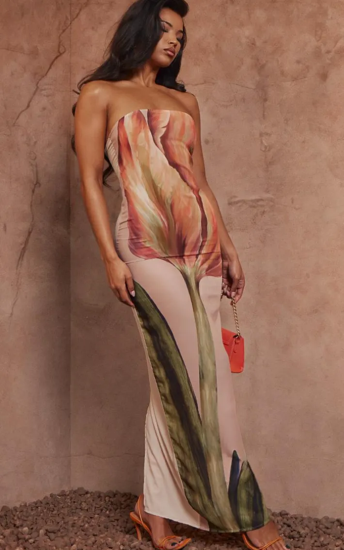 Have all the attention on you with this stone oversized chiffon floral print bandeau maxi dress. This maxi dress is brought to you in a stone chiffon floral print material with an oversized fit, a bandeau style and a maxi length, how could you turn this down? This maxi dress is everything and more we’re loving paired with your clear high heels and accessories for glam finish.
