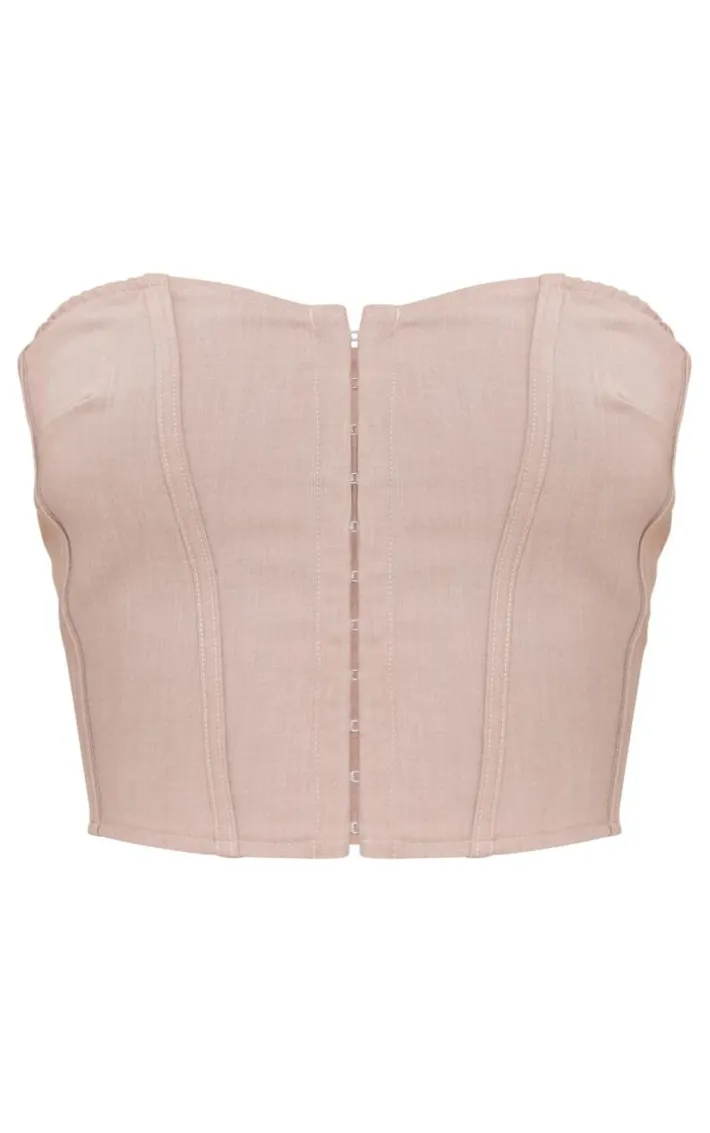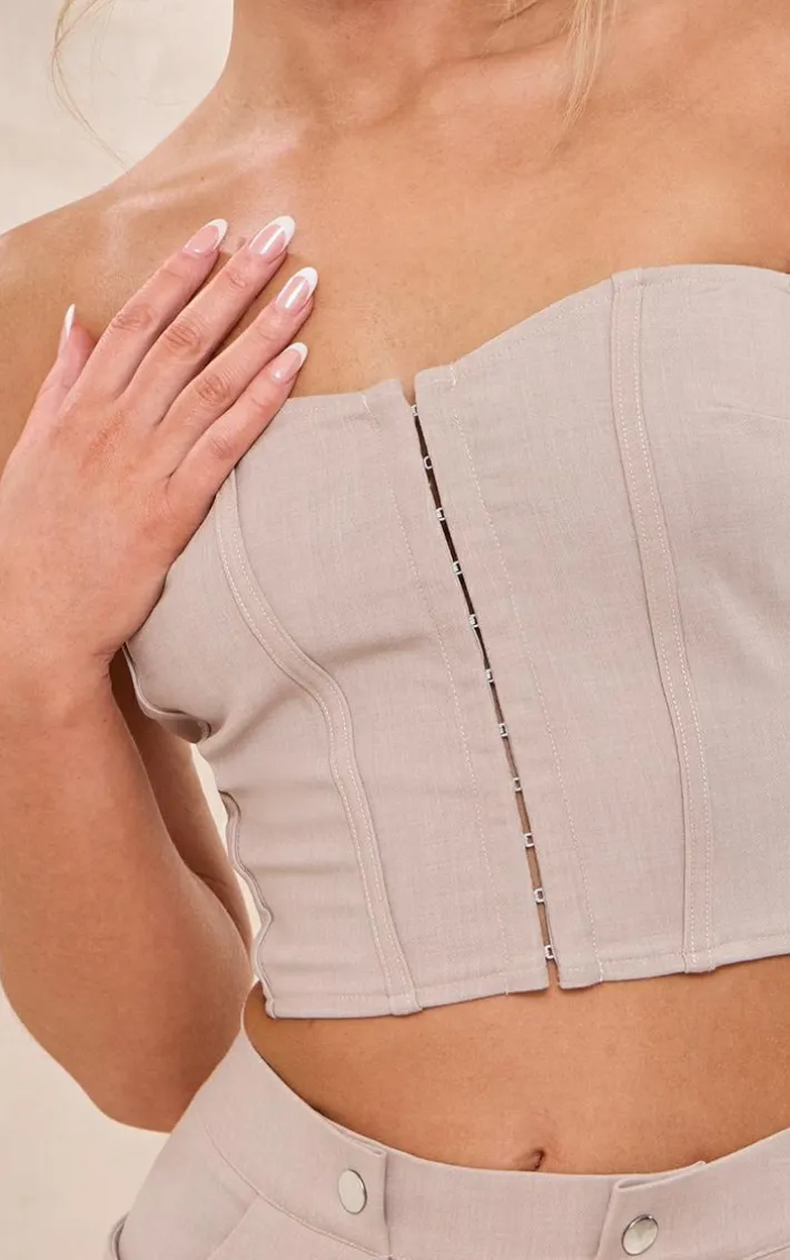 Get ready for your weekend plans with this stone premium woven hook and eye detail bandeau corset. Brought to you in a stone woven material with a hook and eye design and a bandeau style, this corset is perfect for your next date night and beyond. Style with the matching pants, heels and your fave accessories for a combo we’re crushing on.