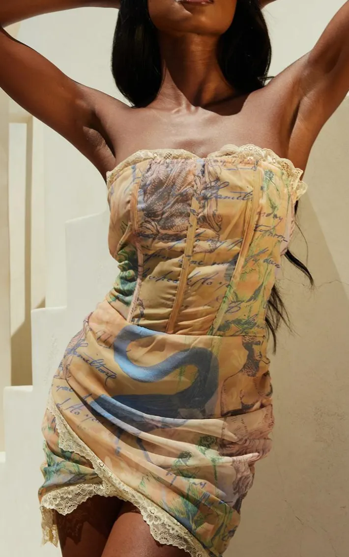 Add some of this seasons must-have prints into your weekend wardrobe with this stone renaissance print lace trim corset bodycon dress. This dress is brought to you in a stone renaissance print material with a lace trim and a corset design, what’s not to love? With it’s figure-hugging fit you’re sure to have heads turn for all the right reasons. Wear this with clear high heels and accessories for a next-level look.