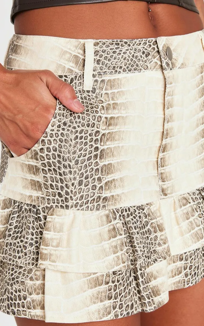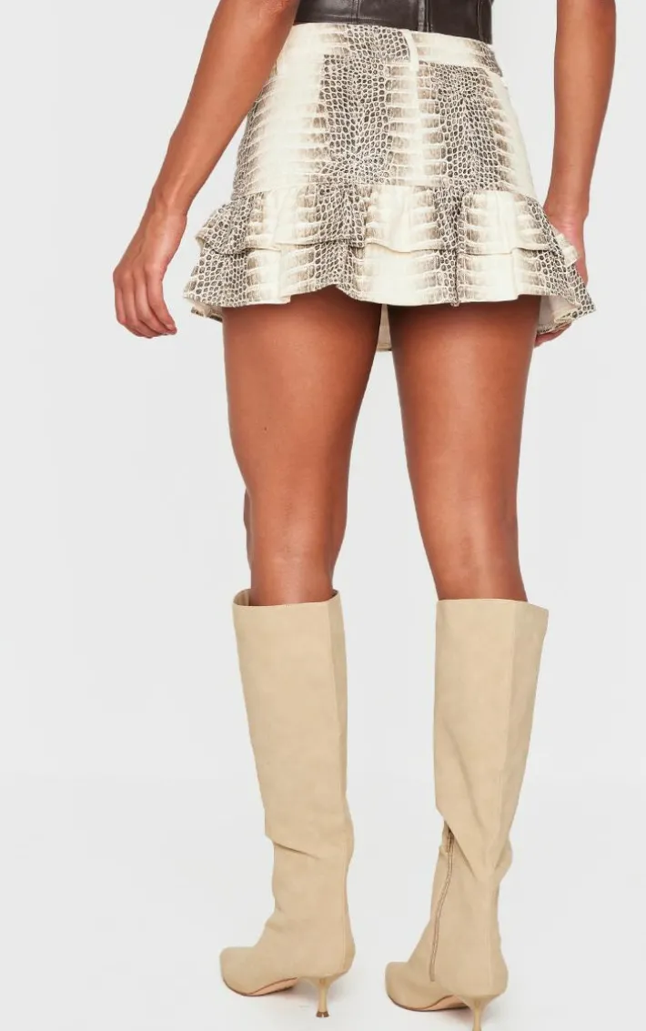 This stone snake print faux leather frill hem mini skirt is a must have weekend piece. Brought to you in a statement stone snake print design, with a flattering faux leather material and frill hem detail, what’s not to love? Simply pair with a brown faux leather top, suede knee length boots and simple accessories to let the skirt speak for itself.