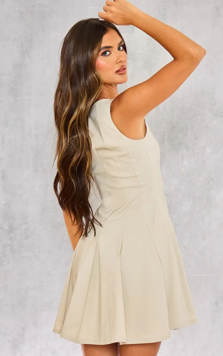Look all kinds of chic in this stone stretch woven racer pleated shift dress. Brought to you in a stone hue stretch woven material with a racerneck design and pleated detailing, what more could you ask for? Style this shift dress with heels and gold accessories for a look that is sure to make heads turn.