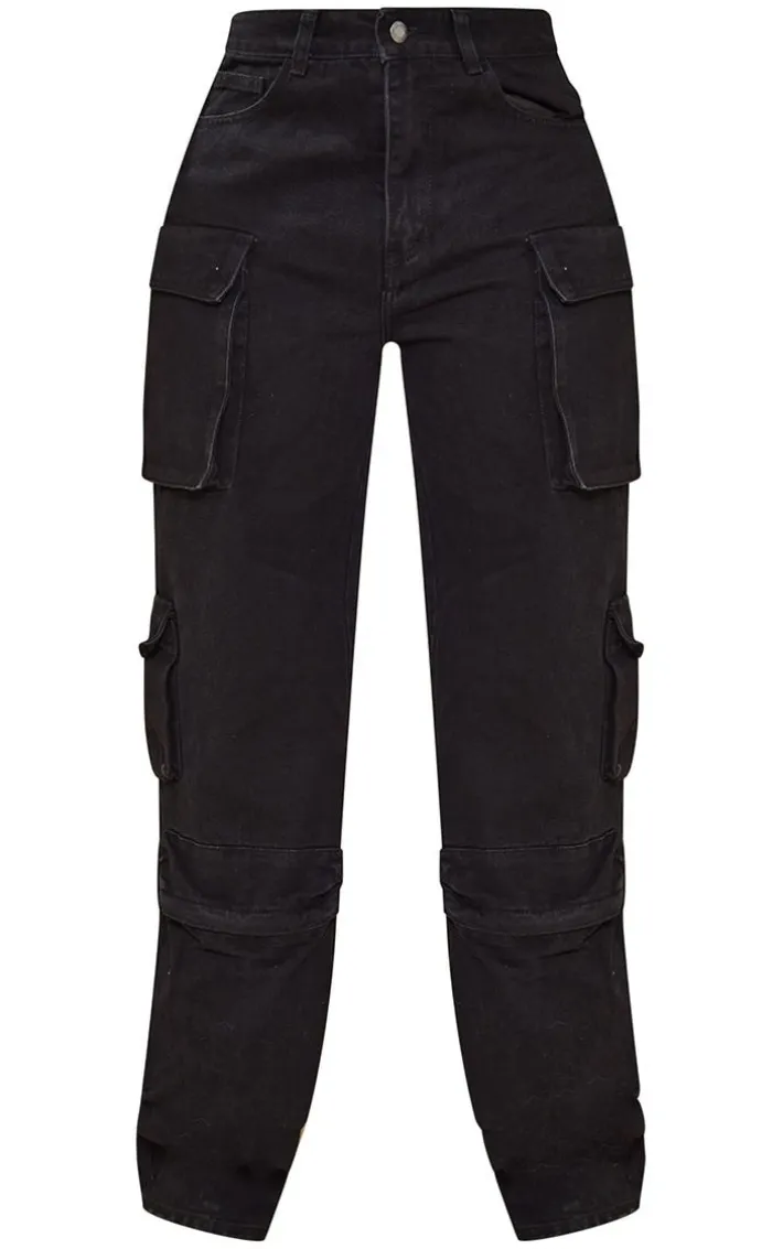 Keep your off-duty look fresh with these jeans. Featuring a black denim stretch material with a cargo design and a wide leg fit, what’s not to love? Wear with a white crop top and chunky kicks to complete the look.