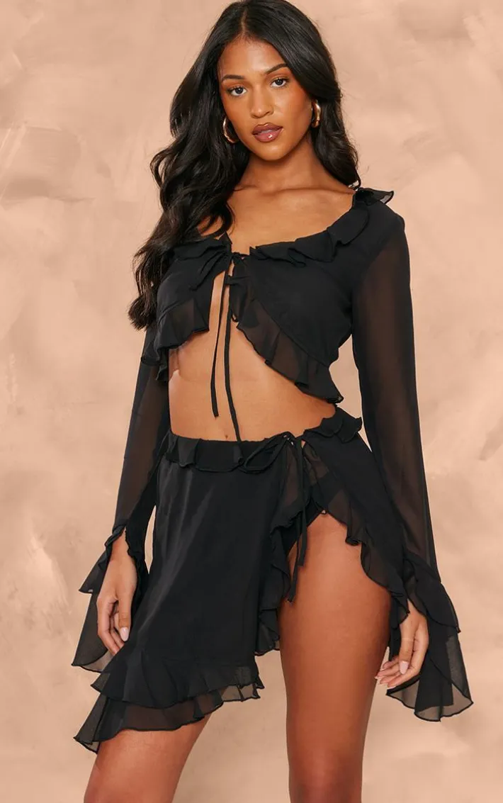 When the dress code calls for glam, we’ve got you covered with this tall black chiffon frill detail tie crop top. Brought to you in a black chiffon material with frill detail, a tie front and a cropped length, you really can’t go wrong. Style this with the matching mini skirt, gold accessories and slip-on heels for a look that is sure to turn heads.