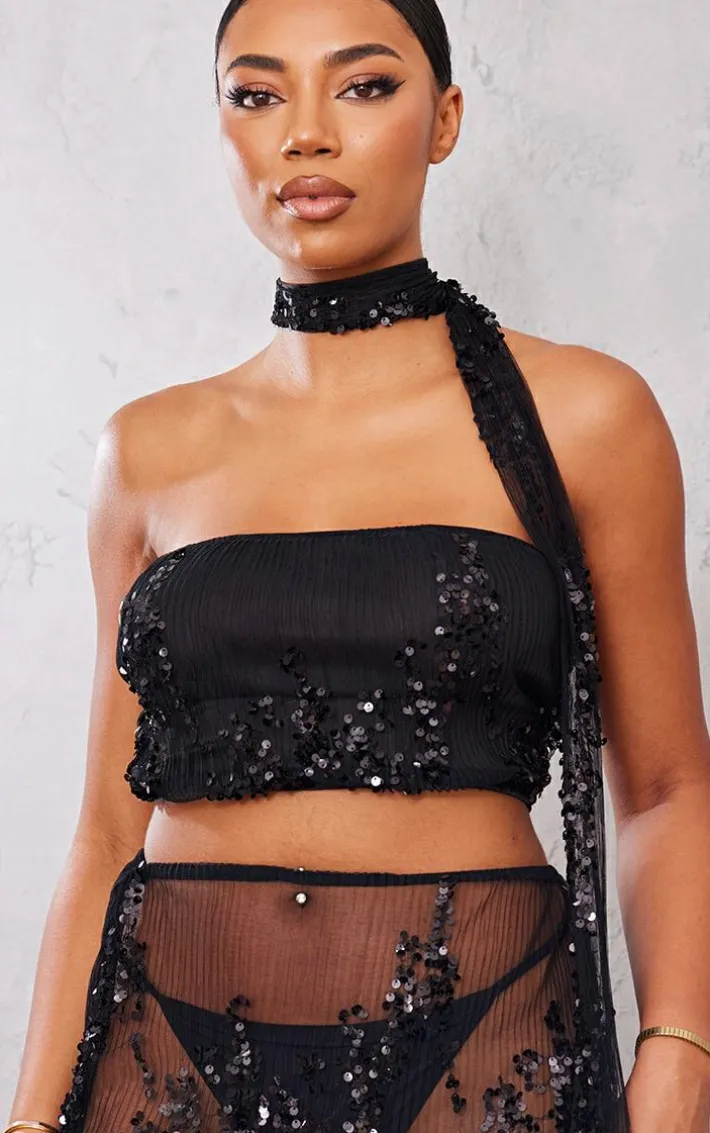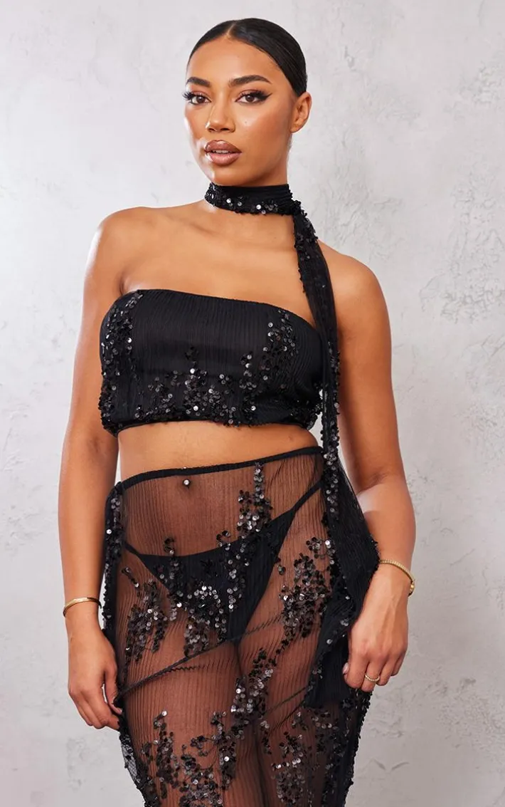 Your new season wardrobe is calling out for this tall black sequin detail bandeau crop top. Brought to you in a black material with a sequin detail and a bandeau fit, we are seriously obsessing over this crop top. What are you waiting for ? Shop the look by pairing it with a sheer skirt and your fave accessories for a look that will have heads turning for all the right reasons.