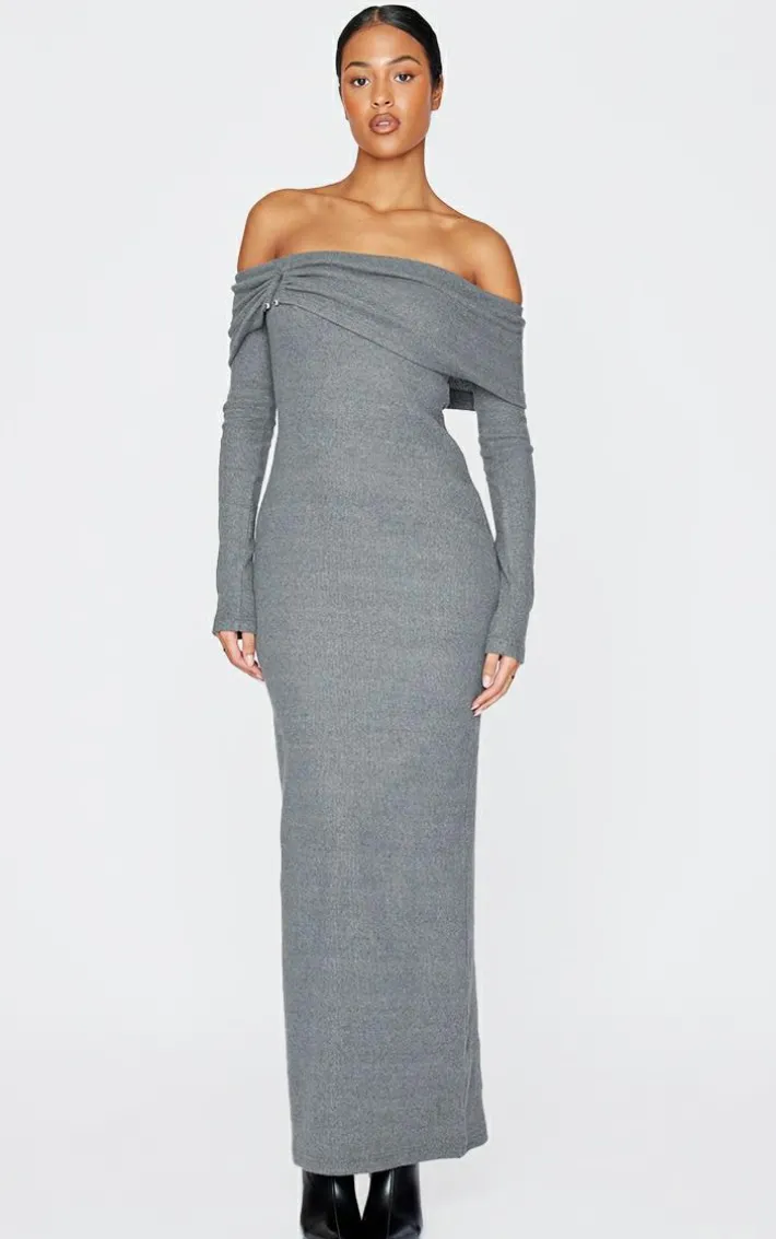 Embrace your femininity with this tall charcoal heavy brushed rib bardot trim maxi dress. With its charcoal hue fabric, heavy brushed rib texture and bardot trim feature, this maxi dress is just what your weekend plans are calling out for. Style with black heeled boots and classic silver jewelry for an unmissable look.